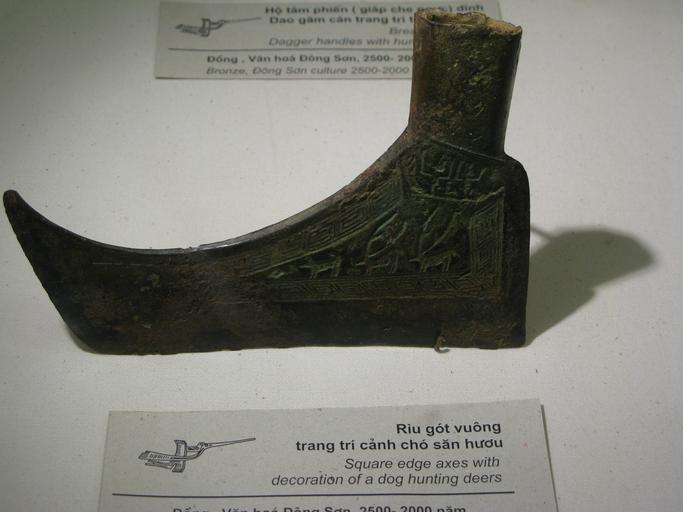 | Keywords: Dong Son axe.JPG en A square-edge axe with decoration of dog hunting deer Dong Son culture 500 BCE-0 vi Một lưỡi rìu gót vuông có trang trí cảnh chó săn hươu di vật văn hóa Đông Sơn 500 TCN-0 Own Bình Giang 2009-04-13 Bình Giang Dong Son culture Bronze axes Pictures by Binh Giang Bronze in the National Museum of Vietnamese History |