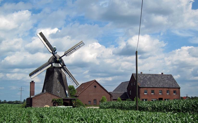 Keywords: donsbrüggen germany windmill buildings structure energy field corn crop farm rural architecture sky clouds nature outside country countryside summer spring