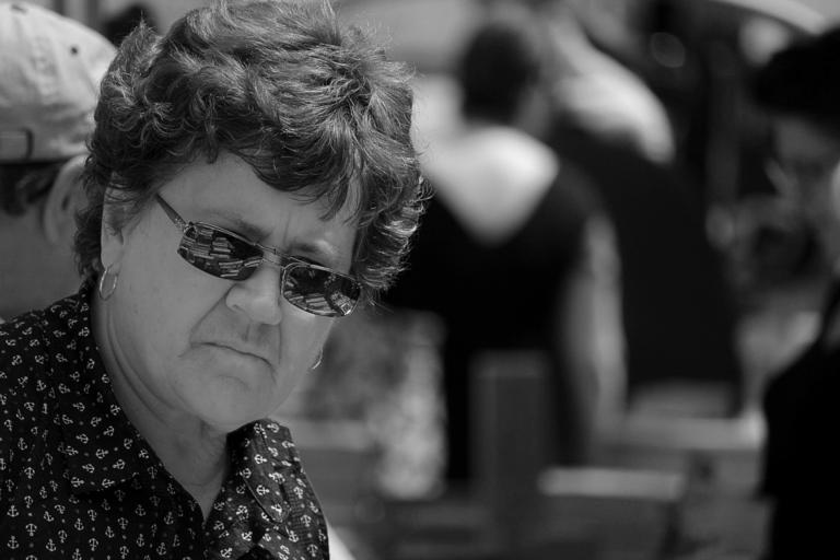 Keywords: blackandwhite black white bw monochrome street streetphotography contrasts woman female person summer outdoors blockparty canada britishcolumbia bc okanagan kelowna glasses