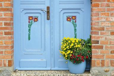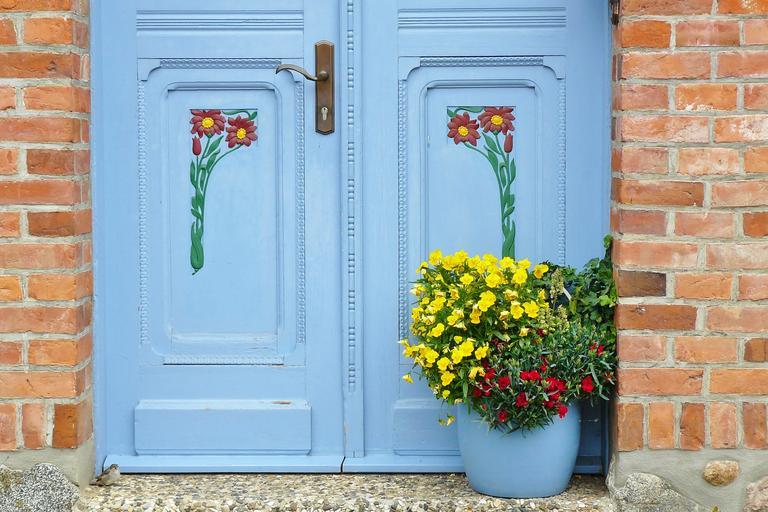 Keywords: door input house entrance old door wood input range wooden door front door ornament painting planters floral decorative artfully clinker bricks carving flowers flowerpot deco plant decoration door handle door lock hauswand colorful blue
