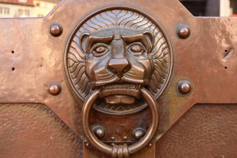 Keywords: doorknocker lion head brass metal input door old art arts crafts craft hand labor gate artfully fig head house entrance