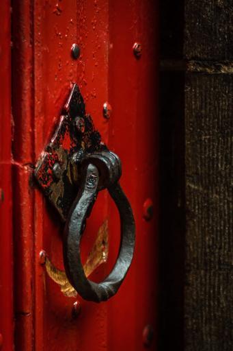 Keywords: doorknocker red door thumper metal ring input fitting door hardware paint wood old antique metal handle wooden door rivet iron wear corrosion