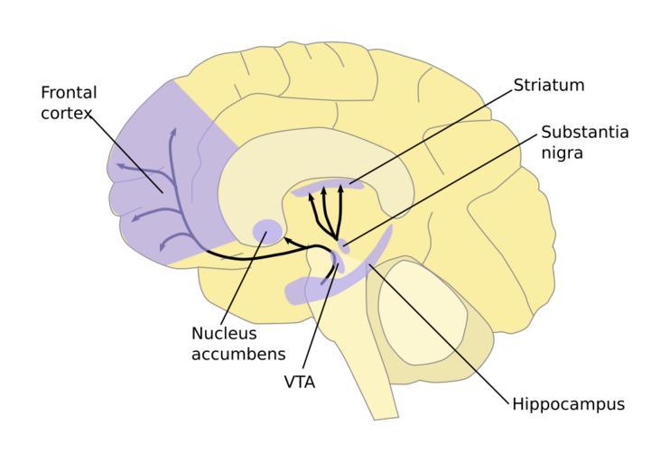 | Keywords: Dopamine pathways.svg en Dopamine Pathways In the brain dopamine plays an important role in the regulation of reward and movement As part of the reward pathway dopamine is manufactured in nerve cell bodies located within the ventral tegmental area VTA and is released in the nucleus accumbens and the prefrontal cortex Its motor functions are linked to a separate pathway with cell bodies in the substantia nigra that manufacture and release dopamine into the striatum 2012-06-17 Derivative work of File Dopamine Pathways png NIDA Quasihuman NIH Uploaded with UploadWizard Dopamine Ventral tegmental area Substantia nigra Nucleus accumbens Striatum Prefrontal cortex Hippocampus anatomy Mesencephalon Dopamine pathway |