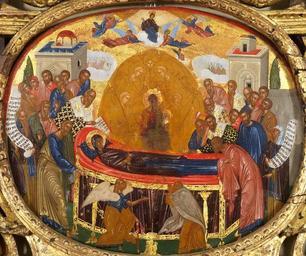 | Keywords: Dormition (c. 1600, Cretan school).jpg  Η Κοίμηση της Παναγίας γύρω στο 1600 37 5x32 2εκ άγνωστος ζωγράφος α ό την Κρήτη Στην εικόνα αυτή με το ελλειψοειδές σχήμα  αριστάνονται η Κοίμηση της Θεοτόκου η  ετάσταση και το ε εισόδιο του Ιεφωνία Η Κοίμηση της Θεοτόκου με τη μεγάλη νεκρική κλίνη τον Χριστό  ου  αραλαμβάνει την ψυχή της Παναγίας τους α οστόλους και τους δύο υμνογράφους Ιωάννη Δαμασκηνό και Κοσμά  ελωδό ανα τύσσεται στο κεντρικό τμήμα της ε ιφάνειας Οι α όστολοι έρχονται α ό τα  έρατα του κόσμου ε άνω σε δύο νεφελώματα Ό ως συνηθίζεται το ε εισόδιο με τον αρχάγγελο  ιχαήλ  ου κόβει τα χέρια του Ιεφωνία  αριστάνεται σε μικρότερη κλίμακα μ ροστά α ό την κλίνη και στον ουρανό βρίσκεται η  ετάσταση της Θεοτόκου Στο τελευταίο ε εισόδιο η Παναγία μεταφέρεται ε άνω σε νεφέλωμα α ό δύο αγγέλους στον ουρανό Δύο άλλοι άγγελοι έχουν ανοίξει τις  ύλες του ουρανού για να την υ οδεχτούν Η κορνίζα είναι ξυλόγλυ τη με διάτρητη διακόσμηση σε στυλ μ αρόκ  ου  εριλαμβάνει την αετωματική ε ίστεψη αγγέλους γιρλάντες και ερωτιδείς http //eib xanthi ilsp gr/gr/icons asp 1600 unknown painter Cretan workshop Icons of Dormition of Virgin Mary Files uploaded by Shakko from various sources Cretan School PD-old 17th-century icons of Greece |