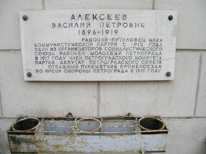 | Keywords: Doska Alekseev V P.jpg ru Ул Васи Алексеева Алексеев Василий Пет ович 1896 1919 Рабочий-путиловец член коммунистической па тии с 1912 года один из о ганизато ов социалистического союза молодёжи Пет ог ада в 1917 году член пет ог адского комитета па тии депутат пет ог адского совета отважный пулемётчик б онепоезда во в емя обо оны Пет ог ада 1919 году own 13243546A 2010-09-28 Ул Васи Алексеева Алексеев Василий Пет ович 1896 1919 Рабочий-путиловец член коммунистической па тии с 1912 года один из о ганизато ов социалистического союза молодёжи Пет ог ада в 1917 году член пет ог адского комитета па тии депутат пет ог адского совета отважный пулемётчик б онепоезда во в емя обо оны Пет ог ада 1919 году Plaques in Russian Vasi Alekseeva Street Alekseev_V_P |
