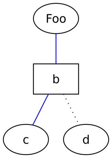 | Keywords: DotLanguageAttributes.svg 2007-03-07 own assumed AzaToth <code><pre> graph graphname // The label attribute can be used to change the label of a node a label Foo ; // Here the node shape is changed b shape box; // These edges both have different line properties a -- b -- c color blue; b -- d style dotted; </pre></code> Tree charts Images with Dot source code |