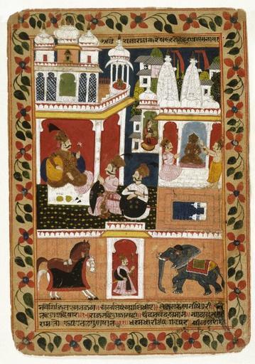 Keywords: Double-sided Leaf from a Chandana Malayaqiri Varta Series Ascribed to the artists Karam and Mahata Chandji.jpg Whereas most manuscript paintings made in Rajasthan in the eighteenth century were commissioned by Hindu rulers this painting was made for a practitioner of the Jain religion probably a wealthy merchant The image illustrates a Jain text though the precise subject is difficult to identify and includes a small shrine with an icon of a Jain savior known as a Jina or Tirthankara on the right The icon sits cross-legged in a meditative posture and the temple has two white towers of the classic North Indian form In a nice detail a small pool in front of the temple reflects the surrounding architecture 1745 Opaque watercolor and gold on paper Overall 11 3/8 x 7 7/8 in 28 9 x 20 0 cm Institution Brooklyn Museum object history credit line Gift of Mr and Mrs Paul E Manheim accession number 69 125 5 http //www brooklynmuseum org/opencollection/labs/splitsecond/painting php id 54 Chandana Malayaqiri Varta Series PD-old-100 Uploaded with UploadWizard 18th-century Mughal miniatures 18th-century paintings from India in the Brooklyn Museum 1745 watercolor paintings 1740s paintings from India Jain art in India Illuminated manuscripts created in India Jain manuscripts |