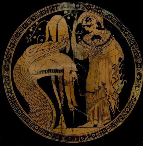| Keywords: Douris cup Jason Vatican 16545.jpg Jason being regurgitated by the snake who keeps the Golden Fleece center hanging on the tree ; Athena stands to the right Red-figured cup by Douris c 480-470 BC From Cerveteri Etruria Jason régurgité par le serpent gardien de la Toison d'or pendue sur l'arbre au centre ; Athéna se tient à droite Coupe à figures rouges de Douris v 480-470 av J -C Provenance Cerveteri Étrurie Museum musei Vaticani Museo Gregoriano Etrusco object history credit line accession number Inv 16545 Shii 2006-03-20 other versions Shii Athena in ancient Greek pottery Dragons in ancient Greek pottery Golden Fleece Jason in ancient Greek pottery Kylix interiors Douris Ancient Greek pottery in Rome Vaticano Ancient Greek pottery in the Museo Gregoriano Etrusco 480s BC Ancient Greek pottery from Cerveteri Plants in ancient Greek pottery checked |