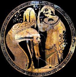 | Keywords: Douris cup Jason Vatican crop.jpg File Douris cup Jason Vatican 16545 jpg Higher resolution Jason being regurgitated by the snake who keeps the Golden Fleece center hanging on the tree ; Athena stands to the right Red-figured cup by Douris c 480-470 BC From Cerveteri Etruria Jason régurgité par le serpent gardien de la Toison d'or pendue sur l'arbre au centre ; Athéna se tient à droite Coupe à figures rouges de Douris v 480-470 av J -C Provenance Cerveteri Étrurie Museum musei Vaticani Museo Gregoriano Etrusco object history credit line accession number Inv 16545 Cropping from File Douris cup Jason Vatican 16545 jpg other versions Shii Athena in ancient Greek pottery Dragons in ancient Greek pottery Golden Fleece Jason in ancient Greek pottery Kylix interiors Douris Ancient Greek pottery in Rome Vaticano Ancient Greek pottery in the Museo Gregoriano Etrusco 480s BC Ancient Greek pottery from Cerveteri Plants in ancient Greek pottery |