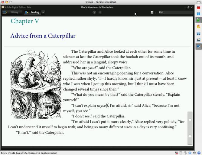 | Keywords: alice in wonderland aliceinwonderland ebook winxp adobe digital editions digitaleditions outdoor XHTML eBook rendered through Adobe's new "Digital Editions" beta ebook reader application (itself seemingly a Flash based application), running on Win XP which is running inside of Parallels, which is running on OS X. XHTML eBook rendered through Adobe's new "Digital Editions" beta ebook reader application (itself seemingly a Flash based application), running on Win XP which is running inside of Parallels, which is running on OS X. |