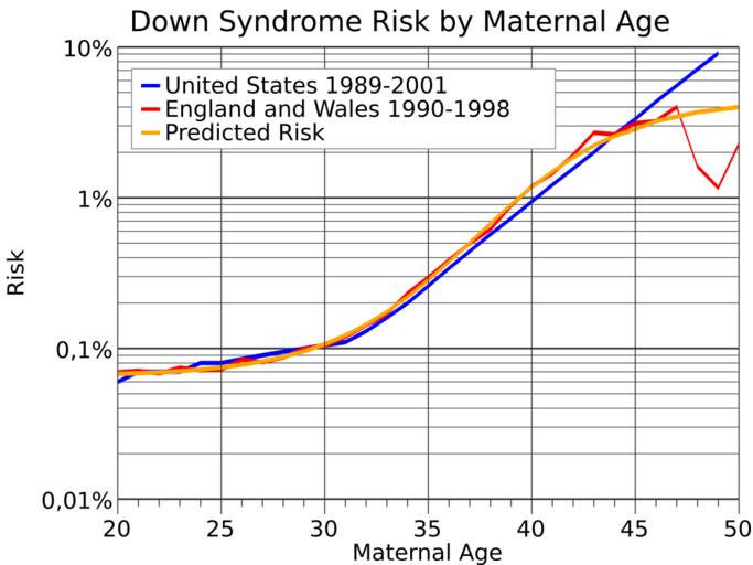 | Keywords: Down Syndrome Risk by Maternal Age-semilog.svg translate yes en Down syndrome risk increases slightly with age up to 31 years old and more rapidly to age 40 increasing from about 0 1 to about 1 The variation of displayed risk between the United States the predicted risk and that observed in England and Wales is not statistically significant Data from England and Wales and the predicted risk are fromhttps //www ncbi nlm nih gov/pubmed/11943789 while the United States data is fromhttp //downsyndrome about com/od/diagnosingdownsyndrome/a/Matagechart htm Predicted risk 1/ 1+exp 7 330-4 211/ 1+exp -0 282x age-37 23 2014-08-22 own Delphi234 Data wikitable - Age United States<br>1989-2001 England and Wales<br>1990-1998 Predicted Risk - 15 1 2434 1 1513 - 16 1 2013 1 1509 - 17 1 1599 1 1504 - 18 1 1789 1 1497 - 19 1 1440 1 1488 - 20 1 1667 1 1441 1 1476 - 21 1 1429 1 1409 1 1461 - 22 1 1429 1 1465 1 1441 - 23 1 1429 1 1346 1 1415 - 24 1 1250 1 1396 1 1381 - 25 1 1250 1 1383 1 1339 - 26 1 1176 1 1187 1 1285 - 27 1 1111 1 1235 1 1219 - 28 1 1053 1 1147 1 1139 - 29 1 1000 1 1002 1 1045 - 30 1 952 1 959 1 937 - 31 1 909 1 837 1 819 - 32 1 769 1 702 1 695 - 33 1 625 1 589 1 571 - 34 1 500 1 430 1 455 - 35 1 385 1 338 1 352 - 36 1 294 1 259 1 266 - 37 1 227 1 201 1 199 - 38 1 175 1 162 1 148 - 39 1 137 1 113 1 111 - 40 1 106 1 84 1 85 - 41 1 82 1 69 1 67 - 42 1 64 1 52 1 54 - 43 1 50 1 37 1 45 - 44 1 38 1 38 1 39 - 45 1 30 1 32 1 35 - 46 1 23 1 31 1 31 - 47 1 18 1 25 1 29 - 48 1 14 1 62 1 27 - 49 1 11 1 86 1 26 - 50 1 44 1 25 cc-zero Uploaded with UploadWizard Down syndrome |