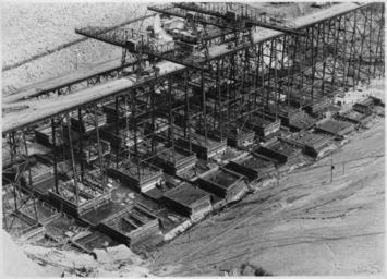 Keywords: Downstream view of concrete blocks under construction on west side - NARA - 294297.jpg Scope and content Photograph from Volume Two of a series of photo albums documenting the construction of the Grand Coulee Dam and related work on the Columbia Basin Project General notes 294297 Local identifier Department of the Interior Bureau of Reclamation Engineering and Research Center 05/18/1981 - 03/04/1988 NARA's Rocky Mountain Region Denver NRGA Building 48 Denver Federal Center West 6th Avenue and Kipling Street Denver CO 80225-0307 1936-03-31 Record group Record Group 115 Records of the Bureau of Reclamation 1889 - 2008 Record group ARC 444 Photograph albums compiled 1903 - 1972 Series ARC 293611 File unit File unit ARC Variant control numbers NAIL Control Number NRG-115-CONSTPHO85006-COLBASIN21025 Other versions <gallery> File Downstream view of concrete blocks under construction on west side - NARA - 294297 tif tif </gallery> NARA-cooperation PD-USGov Construction of the Grand Coulee Dam |