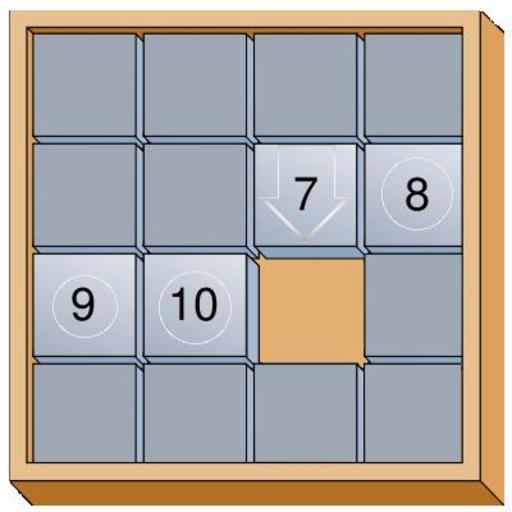 Keywords: Downwards.jpg en moving a tile in a 15-puzzle downwards de Ein Spielstein wird im 15-Puzzle vertikal bewegt own Zarek 2008-10-01 15 puzzle