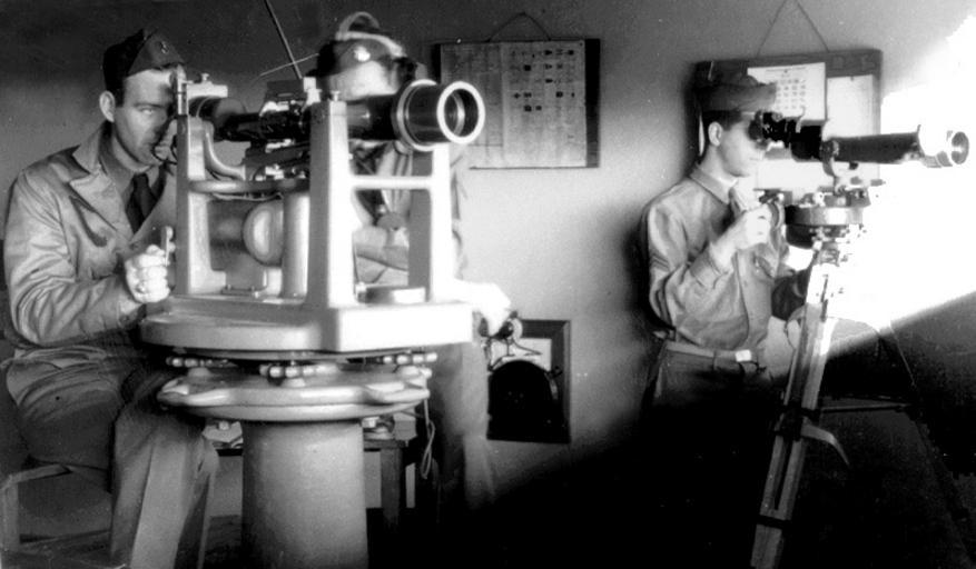 Keywords: DPF and Azimuth Scope.jpg This image shows a depression position finder DPF on the left and an azimuth scope on the right Both instruments could be used to measure the azimuth of a target from the observation station; the DPF could also be used to measure the range to the target The DPF was normally installed with its heavy steel base bolted to an octagonal concrete pad that protruded 6 inches or so from the floor of the observation station An azimuth scope was usually supported by a portable tripod as shown here although it could also be mounted to a concrete-filled steel pipe The pintle center of the DPF the cylindrical mount-point in the center of the upper platform with the H -shaped trusses to its front and rear was taken as the point being observed from and its latitude and longitude were precisely determined by survey techniques This position was used in triangulating the position of the observed target This position was often also marked by means of a brass survey marker emplaced in the roof of the fire control structure directly above the pintle center location The operator of the DPF is seated on a wooden bench using the DPF to waterline a target placing the crosshairs on the ship's waterline just under its forward mast When the operator indicated that he had the target sighted correctly the talker to his left wearing the telephone set would read the azimuth and possibly also the distance to the target off of dials on the DPF and repeat these data to the plotting room where they were used in the fire control process The azimuth scope was often used in the process of spotting the fall of fire shell splashes from the battery being directed and to call out corrections to the battery's aim over short left or right The cross-shaped wooden standard hanging on the wall behind the DPF in this photo is a guide for spotting shell splashes Spotting was not always used however It was argued that adjusting fire in this manner could reduce rather than improve its accuracy This photo taken by the U S Coast Artillery has been said to be sited in a fire control station at Fort Standish on Lovells Island in Boston MA It has been re-cropped and adjusted for brightness and contrast by the contributor with editing artefacts removed Government image PD-USGov Original upload log en wikipedia Ktr101 CommonsHelper en wikipedia DPF_and_Azimuth_Scope jpg 2010-09-29 13 17 Pgrig 800×467× 89379 bytes <nowiki>This image shows a depression position finder DPF on the left and an azimuth scope on the right Both instruments could be used to measure the azimuth of a target from the observation station; the DPF could also be used to measure the range to the targe</nowiki> 2010-05-12 20 35 Pgrig 800×467× 127286 bytes <nowiki>The instrument on the left is a Depression Position Finder DPF The one on the right is an azimuth telescope The observer at the DPF targets a distant ship by putting the vertical crosswire of his instrument on the ship's forward funnel and the horizo</nowiki> Fire control towers