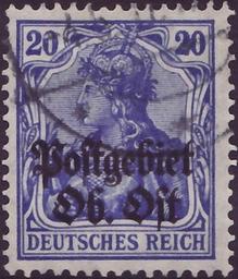 | Keywords: DR 1916 OberOst MiNr020a B002.jpg Stamp of Germany; 1916; postal area Oberbefehlshaber Ost Ober-Ost Michel Germany No 87Ia with two-line black overprint in German type Postgebiet / Ob Ost <br /> Stamp Germany German occupation issues 1914/18 for postal area Ober-Ost Michel No 8a Michel No 87Ia Germany with overprint; Yvert Tellier No 85 with overprint <br />; Germania-Issue Deutsches Reich with striped background<br /> Color ultramarine<br /> Watermark Germany No 1 rhombs <br /> Nominal value 20 Pfennig <br /> Postage value - 1916-01-15 1918-12-28 <br /> scan of original other date 1916-01-15 first issue day <br /> other date 1916-05-04 date of postmark Deutsche Reichspost - Deutsche Landespost Baltikum PD-old PD-Germany-§134-KUG Anna Führing with imperial crown and with two-line black overprint in German type Postgebiet / Ob Ost <br /> Michel No 87Ia; Yvert Tellier No 85; with overprint Michel Ober-Ost No 8a other date 1916-01-15 Deutsche Reichspost - Deutsche Landespost Baltikum Creator Paul Eduard Waldraff Reichsdruckerei Berlin letterpress printing - freedom press comb perforation K 14 14¼ Deutsches Reich - Deutsche Besetzngsausgaben 1914/18 - Postgebiet Oberbefehlshaber Ost Nr 8 a 1916 stamps of the German Empire Overprints on Germania stamps 1916 stamps of Germany for Russia Stamps of the postal area Oberbefehlshaber Ost 08_2 |
