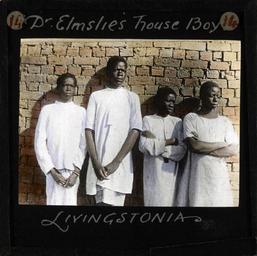 | Keywords: "Dr Elmslie's House Boys, Livingstonia" Malawi, ca.1895 (imp-cswc-GB-237-CSWC47-LS3-1-014).jpg en <br> Dr Elmslie's House Boys Livingstonia Malawi ca 1895 Photograph of four African boys The boys house boys of Dr Walter Angus Elmslie are pictured in front of a red brick wall The houses in the town of Livingstonia are mostly constructed with red bricks ; Walter Angus Elmslie 1856-1935 was the author of Among the wild Ngoni some chapters in the history of the Livingstonia mission in British Central Africa New York 1899 Photographer Unknown Subject personal name Elmslie Walter Angus 1856-1935 Filename imp-cswc-GB-237-CSWC47-LS3-1-014 tif Coverage date circa 1895 Part of collection International Mission Photography Archive ca 1860-ca 1960 Type images Part of subcollection Photographs from the Centre for the Study of World Christianity University of Edinburgh U K ca 1900-ca 1940s Repository name Centre for the Study of World Christianity Archival file impaunpub_Volume7/1402 url Repository address The University of Edinburgh School of Divinity New College Mound Place Edinburgh EH1 2LX United Kingdom Geographic subject country Malawi Format aacr2 1 lantern slide 8 x 8 cm Geographic subject continent Africa Rights Contact the repository for details Part of series Elmslie of the Wild Ngoni LS3/1 Repository email divinity-CSWC ed ac uk Subject lcsh Keyword Children; Housekeeping Date created circa 1895 Publisher of the digital version University of Southern California Libraries Subject aat genre group portraits Format aat lantern slides Legacy record ID impa-m68393 Access conditions http //www ed ac uk/schools-departments/divinity/research/centres/world-christianity/collections-resources File GB 237 CSWC47/LS3/1/14 1895 author http //digitallibrary usc edu/cdm/ref/collection/p15799coll123/id/64523 PD-old-70-1923 Magic lantern images Images from USC Digital Library uploaded by Fæ International Mission Photography Archive ca 1860-ca 1960 History of Malawi |
