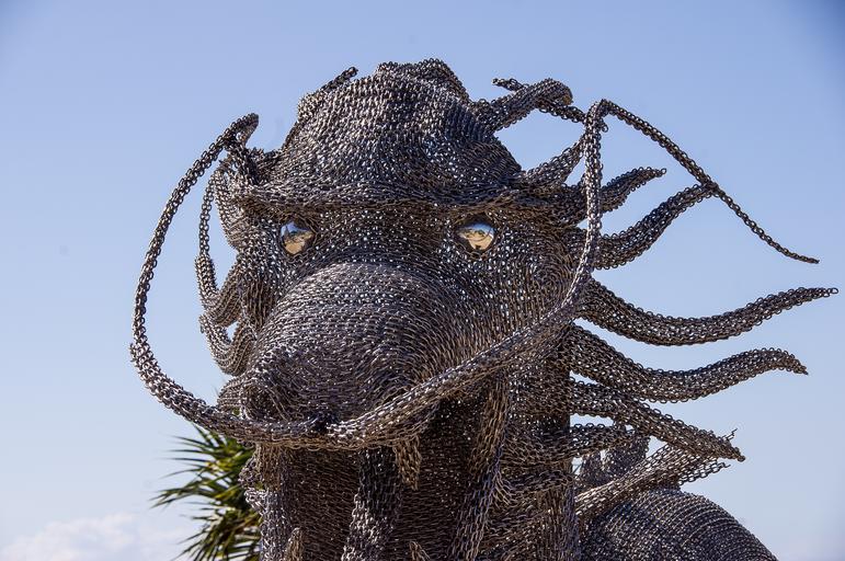 Keywords: dragon head face eyes shiny large model sculpture chain-link metal mythical contemporary modern blue sky australia exhibition