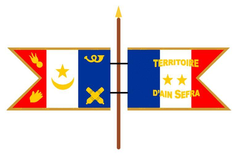 | Keywords: Drapeau de l'Ain-Sefra (Algérie française).png en Ain-Sefra was the capital of a military district and a flag used there was reported by Lucien Philippe This was the vehicle flag or rather pennant of General Laperrine It was swallowtailed and with inscriptions was different on its obverse and reverse The reverse contained the characteristic symbol of Algeria crescent moon and star on the center and cannons trumpet hand of Fatima and bomb on the sides http //flagspot net/flags/dz-frais html http //flagspot net/flags/dz-frais html fr Ain-Sefra a été la capitale d'un district militaire et un drapeau qui y fut utilisé a été rapporté par Lucien Philippe C'était le drapeau du véhicule ou plutôt le fanion du général Laperrine Il était taillé en queue d'aronde et avec ses inscriptions était différent sur son avers et son revers Le revers portait le symbole caractéristique de l'Algérie croissant de lune et étoile sur le centre et les canons la trompette la main de Fatima et la bombe sur les côtés http //flagspot net/flags/dz-frais html http //flagspot net/flags/dz-frais html own Picaballo 01/07/2011 Aïn Sefra Fanion of France Flags of Algeria under French rule Cc-zero |