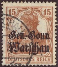 | Keywords: DRBesG 1916 War MiNr11 B002.jpg Stamp of the German Empire - German occupation areas 1914/18 - Poland; definitive stamp Germania-issue war press with black two lines overprint in German letters Gen -Gouv / Warschau for the General-Gouvernement Warschau ; non-striped background<br /> Stamp Michel No 11 German Empire Nr 100a 1916 with overprint ; Yvert Tellier No 11 Poland PL-OA <br /> Color brown ochre to yellow brown<br /> Watermark Germany No 1 rhombs <br /> Nominal value 15 Pfennig <br /> Postage validity - 1916-08-01 1918-12-28 scan of original other date 1916-08-01 first day of the issue Deutsche Reichspost - Deutsche Post in Polen PD-Germany-§134-KUG PD-Polish 1917 <gallery> File DR 1916 100 Germania jpg The same stamp without overprint Michel No 100 war press mint without striped background color variant File 1916 Reich 15Pfg ZUG209 Mi100 jpg The same stamp without overprint Michel No 100 war press cancelled 1916 without striped background color variant File 1917 Reich 15pfg Bingerbrück Mi100 jpg The same stamp without overprint Michel No 100 war press cancelled 1917 without striped background color variant </gallery> Philately Germania-issue war press with black two lines overprint in German letters Gen -Gouv / Warschau without striped background other date 1916-08-01 Deutsche Reichspost - Deutsche Post in Polen Creator Paul Eduard Waldraff Reichsdruckerei Berlin letterpress printing comb perforation K 14 14¼ Deutsche Besetzungausgaben 1914/18 Deutsche Post in Polen Nr 11 1916 stamps of Germany for Poland 11_2_1 Overprints on Germania stamps Brown stamps |