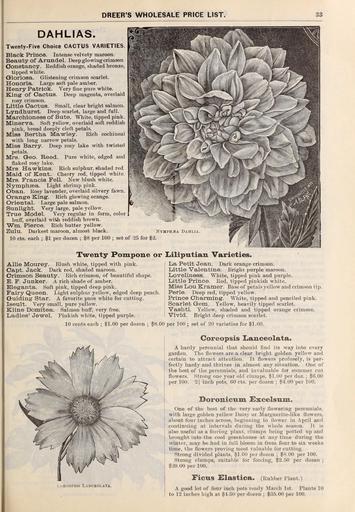 | Keywords: Dreer's wholesale price list (16598750140).jpg DREER'S WHOLESALE PRICE LIST <br> 33 <br> DAHLIAS <br> Twenty-Five Choice CACTUS VARIETIES <br> Black Prince Intense velvety maroon <br> Beauty of Arundel Deep glowing crimson <br> Constancy Reddish orange shaded bronze <br> tipped white <br> Gloriosa Glistening crimson scarlet <br> Honoria Large soft pale amber <br> Henry Patrick Very fine pure white <br> King of Cactus Deep magenta overlaid <br> rosy crimson <br> Little Cactus Small clear bright salmon <br> Lyndhurst Deep scarlet large and full <br> Marchioness of Bute White tipped pink <br> Minerva Soft yellow overlaid soft reddish <br> pink broad deeply cleft petals <br> Miss Bertha Mawley Rich cochineal <br> with long narrow petals <br> Miss Barry Deep rosy lake with twisted <br> petals <br> Mrs Geo Reed Pure white edged and <br> flaked rosy lake <br> Mrs Hawkins Rich sulphur shaded red <br> Maid of Kent Cherry red tipped white <br> Mrs Francis Fell New blush white <br> Nymphsea Light shrimp pink <br> Oban Rosy lavender overlaid silvery fawn <br> Orange King Rich glowing orange <br> Oriental Large pale salmon <br> Sunlight Very large pale yellow <br> True Model Very regular in form color <br> buff overlaid with reddish brown <br> Wm Pierce Rich butter yellow <br> Zulu Darkest maroon almost black <br> 10 cts each ; 1 per dozen ; 8 per 100 ; set of 25 for 2 <br> Twenty Pompone or Liliputian Varieties <br> AUie Mourey Blush white tipped with pink <br> Capt Jack Dark red shaded maroon <br> Crimson Beauty Rich crimson of beautiful shape <br> E F Junker A rich shade of amber <br> Eleganta Soft pink tipped deep pink <br> Fairy Queen Light sulphur yellow edged deep peach <br> Guiding Star A favorite pure white for cutting <br> Iseult Very small pure yellow <br> Kline Domitea Salmon buflf very free <br> Ladies' Jewel Pinkish white tipped purple <br> La Petit Jean Dark orange crimson <br> Little Valentine Bright purple maroon <br> Loveliness White tipped pink and purple <br> Little Prince Red tipped pinkish white <br> Miss Lou Kramer Base of petals yellow and crim son tip <br> Perle Deep red tipped yellow <br> Prince Charming White tipped and penciled pink <br> Scarlet Gem Yellow heavily tipped scarlet <br> Vashti Yellow shaded and tipped orange crimson <br> Vivid Bright deep crimson scarlet <br> 10 cents each ; 1 00 per dozen ; 8 00 per 100 ; set of 20 varieties for 1 60 <br> H'ltiOISIS Lanceolata <br> Coreopsis Lianceolata <br> A hardy perennial that should find its way into every <br> garden The flowers are a clear bright golden yellow and <br> certain to attract attention It flowers profusely is per- <br> fectly hardy and thrives in almost any situation One of <br> the best of the perennials and invaluable for summer cut <br> flowers Strong one year old clumps 1 00 per doz ; 6 00 <br> per 100 2 inch pots 60 cts per dozen ; 4 00 per 100 <br> Doronicum Sxcelsum <br> One of the best of the very early flowering perennials <br> with large golden yellow Daisy or Marguerite-like flowers <br> about four inches across beginning to flower in April and <br> continuing at intervals during the whole season It is <br> also useful as a forcing plant clumps being potted up and <br> brought into the cool greenhouse at any time during the <br> winter may be had in full bloom in from four to six weeks <br> time the flowers proving most valuable for cutting <br> Strong divided plants 1 00 per dozen ; 8 00 per 100 <br> Strong clumps suitable for forcing 2 50 per dozen ; <br> 20 00 per 100 <br> FicUS £lastica Rubber I'lant <br> A good lot of four inch pots ready March 1st Plants 10 <br> to 12 inches high at 1 50 per dozen ; 35 00 per 100 45213473 161077 84662 Page 33 Text Winter Edition http //www biodiversitylibrary org/page/45213473 1898 Dreer Henry A Firm NameFound Coreopsis NameConfirmed Coreopsis L EOLID 38349 NameFound Doronicum NameConfirmed Doronicum EOLID 50225 NameBankID 2658466 NameFound Gloriosa NameConfirmed Gloriosa EOLID 33237 NameBankID 2665167 NameFound Honoria NameFound Lanceolata NameConfirmed LANCEOLATA EOLID 2762079 NameBankID 544027 Biodiversity Heritage Library Dreer's wholesale price list / Garden Stories Bulbs Plants Catalogs Dreer Henry A Firm Nurseries Horticulture Nursery stock Pennsylvania Philadelphia Seed industry and trade Seeds Mertz Library The New York Botanical Garden bhl page 45213473 dc identifier http //biodiversitylibrary org/page/45213473 bhlGardenStories Flowers Dahlia Coreopsis Perennial BHLinbloom bulbs plants dreer henry a firm nurseries horticulture mertz library the new york botanical garden bhlgardenstories bhlinbloom Information field Flickr posted date ISOdate 2015-03-11 CC-BY-2 0 BioDivLibrary https //flickr com/photos/61021753 N02/16598750140 2015-08-24 21 50 54 cc-by-2 0 PD-old-70-1923 1898 books Dreer's wholesale price list Photos uploaded from Flickr by Fæ using a script |