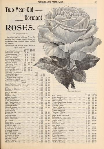 | Keywords: Dreer's wholesale price list (16600033059).jpg WHOLESALE PRICE LIST <br> 3T <br> Tuio-YeaF-Old <br> Dormant <br> Per 100 <br> 20 00 <br> 15 00 <br> 15 GO <br> 15 00 <br> 15 00 <br> 15 00 <br> 12 00 <br> 10 00 <br> 12 00 <br> 12 00 <br> 20 00 <br> ROSES <br> Varieties marked with an can be <br> supplied in own-root plants ; those not <br> marked are dwarf-budded plants worked <br> on Manetti <br> Prices noted are only for orders delivered <br> before April 1st <br> Per doz <br> Augustine Guinoseaux 2 50 <br> American Beauty 3 00 <br> Alfred Colomb 2 00 <br> Anna de Diesbach 2 00 <br> Boule de Neige 2 00 <br> Baroness Rothschild 2 00 <br> Baron de Bonstettin 2 00 <br> Blanche Moreau 1 50 <br> Baltimore Belle 1 25 <br> Chromatella 3 00 <br> Crested Moss 1 50 <br> Comiesse Muranais 1 50 <br> Capt Hayward 2 50 <br> Climbing Devoniensis 3 50 <br> Clothilda Soupert 1 25 <br> Coquette des Alps 2 00 <br> Coquette des Blanches <br> Caroline de Sansal <br> Crimson Rambler Strong <br> Select <br> Capt Christy <br> Common Provence or Cabbage <br> Clio <br> Duchess of Albany <br> Dinsmore <br> Earl of Duflferin <br> Eclaire <br> Eugene Furst <br> Fisher Holmes <br> Gloire de Dijon <br> Gen Jacqueminot <br> Gen Washington <br> Gloire de Margottin <br> Gloire de Mosses <br> Gloire Lyonaisse <br> Gustav Piganeau <br> Helen Keller <br> Henry Martin <br> Hermosa <br> John Hopper <br> Jules Maraottin <br> Louis VanHoutte <br> La Prance <br> Lamaique <br> Lady Helen Stewart <br> Mareclial Niel <br> Mrs J S Crawford <br> Marchioness of liorne <br> Margaret Dickson <br> Mabel Morrison <br> Mad Gabriel Luizet <br> Merveille de Lyon <br> Mrs John Laing <br> – 'Maena Charta <br> Mad Plantipr <br> Marshall P Wilder <br> 10 00 <br> 15 00 <br> 2 00 <br> 00 <br> 00 <br> 50 <br> 00 <br> 00 <br> 50 <br> 00 <br> 00 <br> 00 <br> 00 <br> 00 <br> 00 <br> 00 <br> 50 <br> 00 <br> 00 <br> 50 <br> 00 <br> 50 <br> 50 <br> 50 <br> 25 <br> 50 <br> 00 <br> 00 <br> 00 <br> 50 <br> 50 <br> 00 <br> 00 <br> 50 <br> 00 <br> 00 <br> 00 <br> 00 <br> 00 <br> 50 <br> 25 <br> 00 <br> 15 00 <br> 15 00 <br> 15 00 <br> 20 00 <br> 15 00 <br> 15 00 <br> 20 00 <br> 15 00 <br> 15 00 <br> 15 00 <br> 15 00 <br> 15 00 <br> 15 00 <br> 12 00 <br> 15 00 <br> 15 00 <br> 12 00 <br> 15 00 <br> 12 00 <br> 10 00 <br> 12 00 <br> 15 00 <br> 15 00 <br> 15 00 <br> 20 00 <br> 25 00 <br> 15 00 <br> 20 00 <br> 15 00 <br> 15 00 <br> 15 00 <br> 15 00 <br> 15 00 <br> 12 00 <br> 10 00 <br> 15 00 <br> Margaret Dickson <br> Per doz Per 100 <br> Mad Hardy 1 50 12 00 <br> Marie Bauman 2 00 15 00 <br> Princess Adelaide 1 50 12 00 <br> Paul Neyron 2 00 15 00 <br> Prince Camille de Rohan 2 00 15 00 <br> Persian Yellow 2 00 15 00 <br> Prairie Queen 1 25 10 00 <br> Qaeen'8 Scarlet 1 50 12 00 <br> Queen of Queens 2 00 15 00 <br> Russers Cottage 1 25 10 00 <br> Rugosa White 1 50 12 00 <br> Red 1 50 12 00 <br> Heine Marie Henriette 3 00 <br> Rodocanachi 2 00 15 00 <br> Seven Sisters or Gre villa 1 50 10 00 <br> Sweet Briar 1 50 10 00 <br> Solfatere 3 00 <br> Tennessee Belle 1 25 10 00 <br> Tom Wood 2 50 <br> Ulrich Hrunner 2 00 15 00 <br> Victor Verdier 2 00 15 00 <br> White Provence or Cabbage 1 50 12 00 <br> Waltham Climber 3 00 <br> Wichnrai ana 1 50 12 00 <br> White Baroness 2 00 15 10 <br> White Rambler 2 00 15 00 <br> White Washington 1 50 12 00 <br> Xavier Olibo 2 00 15 00 <br> Yellow Rambler 2 00 15 00 45213842 161077 84662 Page 37 Text Winter Edition http //www biodiversitylibrary org/page/45213842 1900 Dreer Henry A Firm Biodiversity Heritage Library Dreer's wholesale price list / Garden Stories Bulbs Plants Catalogs Dreer Henry A Firm Nurseries Horticulture Nursery stock Pennsylvania Philadelphia Seed industry and trade Seeds Mertz Library The New York Botanical Garden bhl page 45213842 dc identifier http //biodiversitylibrary org/page/45213842 bhlGardenStories Flowers Roses BHLinbloom bulbs plants dreer henry a firm nurseries horticulture mertz library the new york botanical garden bhlgardenstories bhlinbloom Information field Flickr posted date ISOdate 2015-03-11 CC-BY-2 0 BioDivLibrary https //flickr com/photos/61021753 N02/16600033059 2015-08-24 21 58 21 cc-by-2 0 PD-old-70-1923 1900 books Dreer's wholesale price list Photos uploaded from Flickr by Fæ using a script |