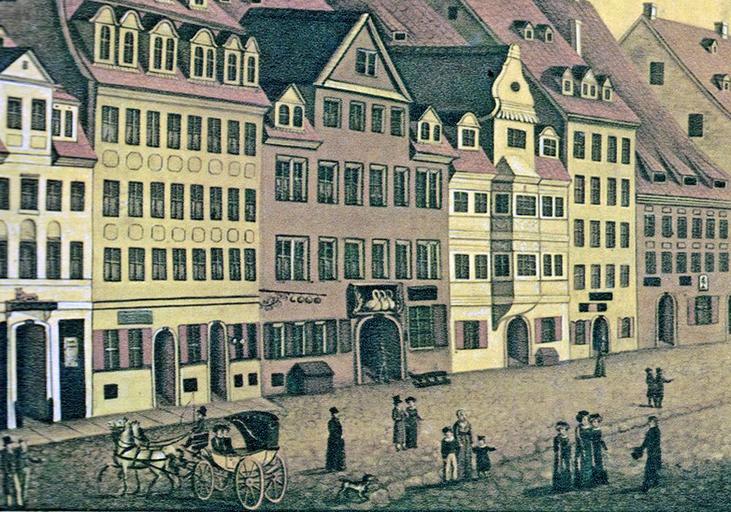 Keywords: Drei Schwanen Leipzig.jpg de Das Gasthaus Zu den Drei Schwanen am Brühl in Leipzig in dem Gottlieb Benedikt Zehmisch den Saal für die Großen Concerte ausbauen ließ Leipziger Blätter Nr 3 S 73 Ausschnitt author um 1800 Gewandhaus Leipzig PD-old |