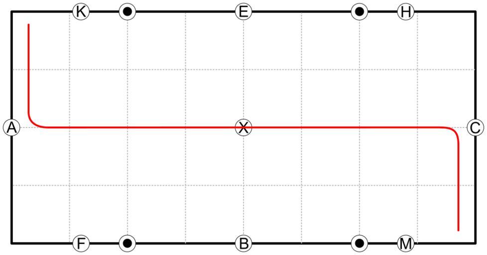 Keywords: Dressurviereck - Durch die Länge der Bahn wechseln quer.svg Dressurviereck 20x40 Meter mit Bahnfigur Durch die Länge der Bahn wechseln rote Linie eingezeichnet Own 2006-08-28 Andreas 06 Riding figures