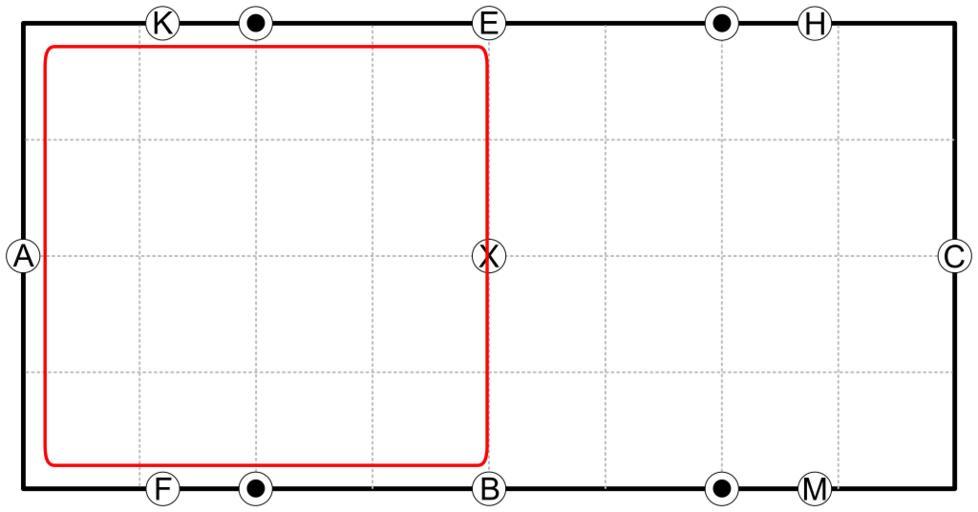 Keywords: Dressurviereck - Halbe Bahn quer.svg Dressurviereck 20x40 Meter mit Bahnfigur Halbe Bahn rote Linie eingezeichnet Own 2006-08-28 Andreas 06 Riding figures
