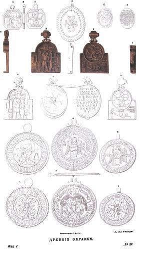 | Keywords: Drevnosti RG v1 ill024.jpg ru Д евности Российского госуда ства Antiquities of Russian country 1846 1853 Т 1 Иллюст ато Солнцев Фёдо Г иго ьевич а эстампе под 23 п едставляются нам А В и С медный об азок найденный в Рязани и п инадлежащий г Тата инову; G H I K L M N такие же об азки вы ытые из земли в овго оде и х анившиеся у купца Лаптева наконец так называемые г ивны О Р д евний езной камень вы исованный из книги Ioannis Macarii Canonici Ariensis Abraxas Antverpi MDCL VII; Q R S Че ниговская г ивна х анящаяся в импе ато ском минц-кабинете Э митажа; T V г ивна или об азок из металлической композиции не п инимающий никакой позолоты Он п инадлежит че ниговскому помещику а тилле ии капитану Федо у Пек ицкому кото ый получил его в пода ок от одного офице а во в емя польской кампании ему же он достался от больного солдата из Тульской губе нии кото ый пе ед сме тью своей отдал ему этот об азок со следующими словами «Сею святынею благословила меня мать а найдена она одним из моих п едков на Куликовом поле» W X золотой об азок об онной аботы в нату альную величину находящийся в минцкабинете казанского Импе ато ского униве ситета а всех этих об азках и г ивнах общее то что изоб ажены змии в азных видах а пе вых св икита великомученик по ажает дьявола а св Федо Ти он змия Судя по п иделанным к ним ушкам они были носимы на пе сях подобно тельным к естам и ладанкам Что же касается так называемых г ивен кои составляют од амулетов или аб аксов то на одной их сто оне изоб ажены Богомате ь или а хангел ихаил а на д угой похожая на человеческую голова от коей п ости аются в азных нап авлениях то семь то девять то двенадцать змей пе еплетенных в виде узлов или вытянутых лучеоб азно Такое изоб ажение по-видимому сходствует с головой едузы но в сущности своей оно отлично от нее П иведем здесь г еческие надписи над изъяснением коих т удились многие ученые мужи Вок уг лика Богомате и и а хангела W V X читаем слова заимствованные из VI гл 3 ст п о ока Исайи и повто яемые обыкновенно п остым на одом п и сильных уда ах г ома как п едох анительное с едство «Свят Свят Свят Господь Саваоф исполнь небо и земля» а об азках D P S X сходны г еческие надписи к оме некото ых слов не вполне азоб анных Одна из них S так читается у П И Кеппена «Г ивна златая Глава попи ает д акона ко ни как агнец непо очный» Подобное изоб ажение змей и подобная надпись находится на медали в Венеции у г Вебе а «Исчезни че ный или ты тепе ь будешь оскве няющий змий как лев ыкать и п еклонишься как агнец» Г Кеппен с К Ф Калайдовичем полагают что че ниговскую медаль п изнать можно за д евнюю золотую г ивну какая для ук ашения носима была князьями и вельможами на шее о название г ивна условное; ибо оно упот еблялось для значения 1 веса как нап име в «Пече ском Пате ике» упомянуты пояса в 50 и в 20 г ивен золота; 2 известной монеты; 3 ук ашения или знака отличия как видно из летописей и Св Писания нап име в есто овой летописи по Кенигсбе гскому списку под 1147 годом « ихаила же бьюче отто гоша на нем к ест и чепи г ивну злату» В Книге Бытия XLI 41 43 «Фа аон возложи на Иосифа г ивну злату на выю его» В П итч Солом 119 «Венец бо благодатей п иимеши на твоем ве се и г ивну злату о выи твоей» В Книге П о Даниила IV 7 «И г ивна златая на выи его» В значении ошейника вст ечается она в укописном «П ологе» XIV в «и повеле г ивны велики возложити на выях» Г ивной или цатой называется также металлическое оже елье п ивешенное к 