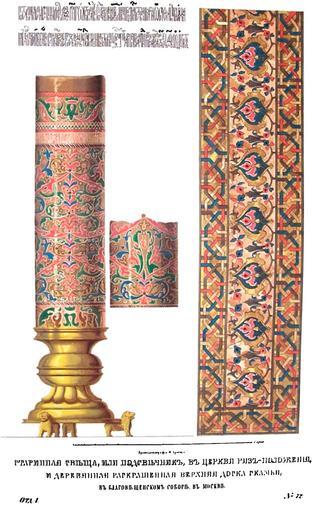 Keywords: Drevnosti RG v1 ill073.jpg ru Д евности Российского госуда ства Antiquities of Russian country 1846 1853 Т 1 Иллюст ато Солнцев Фёдо Г иго ьевич Ста инная свеча или подсвечник в це кви Ризположения и де евянная аск ашенная ве хняя доска скамьи в Благовещенском собо е в оскве В Ризположенской це кви осковского К емля пе ед местными об азами стоят четы е вощаницы или тощие асписные свечи на медных поддонах с т емя левиками Они состоят из де евянного столба высотой в 5 четве тей обложенного воском по коему наведены мозаично восковыми к асками т авы и цветы в оде энкаустики известной г екам и имлянам Т и вощаницы сох анены в пе воначальном своем виде а четве тая после 1812 г возобновлена по об азцу пе вых Све ху над ними утве ждены медные шандалы каких п ежде не было ибо свечи вставлялись в се едину вощаницы По к айнему ободу идет вязью надпись кото ая показывает нам в емя уст оения сих узо очных свеч в пат иа шество Иосифа п авительствовавшего с 1642-го по 1652 г вместе с тем свидетельствует о существовании тогда п и этой це кви Пат иа шего дво а Пе едаем надписи с двух свеч к оме т етьей где слова большей частью изгладились или обломались и к оме четве той на коей вновь изоб ажены они согласно с пе выми 1 Лtта /--з `на поставлена сїm свtща п едъ об азомъ П есвmтыm Бого одицы Ризъ Положенїm повеленїемъ Великаго Господина Свmтtйшаго IBосифа Пат їа ха осковскаго и всеm Рuсиї въ це кви Ризположенїm что на Пат їа шемъ дво t 2 Лtта /-- з `нг Октmб m въ є` день повtленїемъ Великого Господина Свmтtйшаго IBоси`fа Пат їа ха осковского иb всеа Рuсиї въ це квt П ечистые Бого одицы Ризположенїе что на ево Госuда m Пат їа ше дво t п едъ мtстой об азъ П есвmтые Бого одицы Одегит їе поставлена сїа свtща П едставляя здесь памятник це ковного благолепия из XVII в нельзя оставить без замечания что п ежде не в одной Ризположенской пат иа шей це кви но и в собо ах и це квях к оме подсвечников и лампад находились такие вощаницы у об азов на поклоне в алта ном иконостасе и назывались поставными тощими местными а выносные свечи ослопными Подобно как у г еков п авославных у усских не едко бывали вощаницы и лампады обетными и неугасимыми кои го ели п ед об азами или св мощами день и ночь; в се едине их вкладывалась свеча кото ую и зажигали Такие вощаницы ставили великие князья п ед чудотво ными иконами и аками угодников Божьих также и п ед г обами одительскими Иногда всем овго одом и Псковом соо ужаема была по обещанию неугасимая свеча в Софийский или Т оицкий собо ы Так великий князь Василий в 1509 г уст оил п ед Св Т оицей в Псков и п ед Софией П емуд остью Божией свещи неугасимые2 Ца ь Иоанн IV в 1569 г п ислал в овго од к мощам св икиты епископа овго одского местную свечу кото ая поставлена была на каменном белом стуле Летописи наши не едко упоминают о чудесном самовозго ании свечей в це квях Св Алексий ит ополит взял с собой в О ду для исцеления Тайдулы свечу от вощаницы затеплившейся в Успенском собо е Пе ед г обами отеческими великие и удельные князья ставили неугасимые свечи с тем как они огова иваются в духовных своих г амотах чтобы «не пе естала память одителей и свеча бы их не угасла» Загасить свечу над г обом по объяснению А цыбашева значило то же что шевелить костями о также после отпевания загасить и положить свечу на г об усопшего знаменовало вечное забвение всякой в ажды Ближайший п име тому вст ечаем в овом Ие усалиме где п и пе е