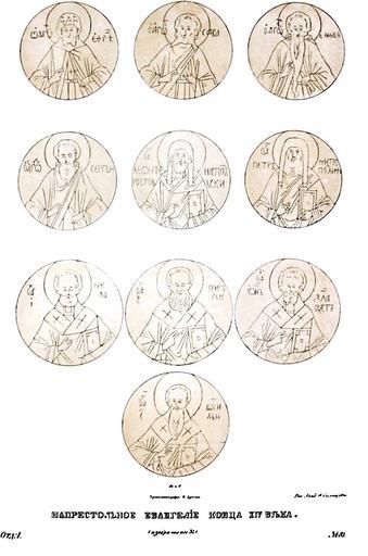 Keywords: Drevnosti RG v1 ill082.jpg ru Д евности Российского госуда ства Antiquities of Russian country 1846 1853 Т 1 Иллюст ато Солнцев Фёдо Г иго ьевич ап естольное Евангелие конца XIV в изоб ажение 1 Ха атейное сие Евангелие в десть писанное уставом пе еплетено в ба хат; ве хняя доска его обложена вызолоченным се еб ом со сканью по к аям зак аи из того же металла с финифтяными изоб ажениями святых Еф ема Саввы Евфимия иколая и ликийского т ех вселенских святителей из московских одного Пет а из остовских Леонтия и п еподобного Се гия По к аям лицевой доски вы езана следующая надпись В лtто /--з`ц 1392 а т индикта л`а оковано быс Еvаг`лїе се п и Велиц`tмъ Княз`t Васильи Дмит їевичt всеа РУ си и П есвещ`нм Кип їан ит ополитt Кїевскомъ всеа РУ си повеленьем а ба Бж`я Fеодо а Анд tевича Последнее имя вст ечается нам в 1371-м и 1389 г между послухами духовного завещания великого князя Дмит ия Ивановича а пе вом листе Евангелия читаем собственно учную подпись мит ополита Платона «Сие Евангелие дано от Великаго Князя Василия Димит иевича подписал сми енный Платон ит ополит осковский и А химанд ит Т оицы Се гиевой лав ы 1798 года» о из пе вой надписи не видно чтобы оно дано было в Се гиеву обитель самим великим князем а только в его княжение уст оено повелением Федо а Анд еевича кото ый был московский боя ин и ве оятно б ат боя свидетельствовавших духовную Великокняжескую Александ а и д угого Федо а Александ овичей Хотя надпись эта п ямо указывает нам на 1392 г уст оения оклада на Евангелие но сему п отиво ечит изоб ажение на нем п еподобного Се гия кото ый п еставился в том же самом году а св мощи его отк ыты и п ославлены в 1425 г Из этого можно с ве оятностью заключать что п и позднейшем возобновлении и ук ашении оклада п исоединен об аз п еподобного основателя Т оицкой лав ы 1846 1853 http //www runiverse ru/bookreader/book403605/ page/61/mode/1up Солнцев Фёдо Г иго ьевич PD-Art Antiquities of Russian country - Volume I Gospel Books covers from Russia Files uploaded by Shakko from various sources Uploaded with UploadWizard Vasily I of Moscow 1392 books Cyprian Metropolitan of Moscow Platon Levshin