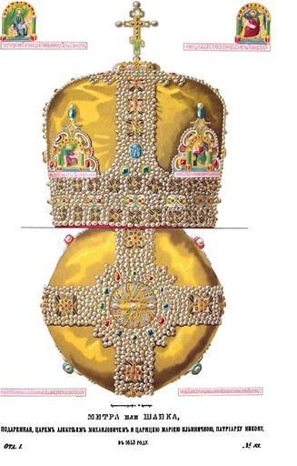 | Keywords: Drevnosti RG v1 ill089.jpg ru Д евности Российского госуда ства Antiquities of Russian country 1846 1853 Т 1 Иллюст ато Солнцев Фёдо Г иго ьевич ит а или шапка пода енная ца ем Алексеем ихайловичем и ца ицей а ией Ильиничной пат иа ху икону в 1653 г Эта д агоценная утва ь подобно п едыдущей есть знак особенного благоволения ца я Алексея ихайловича к икону Пат иа ху кото ого он называл своим д угом Фо мой своей она более походит на д евние мит ы чем д угие пат иа шие мит ы и ко оны Основа ее алтабасная Пе ек естье ее и венец состоят из к упного жемчуга между коим вставлены епьи из д агоценных камней и на пе едней сто оне камей из лазо евого яхонта с изоб ажением Воск есения Х истова Ве х ее осенен восьмиконечным к естом ежду пе ек естьем вставлены четы е клейма финифтяные с изоб ажением четы ех евангелистов П и подножии их наведена финифтью следующая надпись Здtлана сїя святительская шапка Великому Господину Святtйшему икону Пат їа ху осковскому и всея Русїи лtта /--з `kа ма та к`н повелtнїемъ Великаго Гд` я и Великаго Кн`зя Алексїя ихайловича всея Русїи и ево блг`овt ной Ц `цы и Великой Кнг`ни а їи Ильиничны 1846 1853 http //www runiverse ru/bookreader/book403605/ page/61/mode/1up Солнцев Фёдо Г иго ьевич PD-Art Donations of Russian rulers to Church Patriarch Nikon's items 17th-century Orthodox mitres Antiquities of Russian country - Volume I Files uploaded by Shakko from various sources Uploaded with UploadWizard |