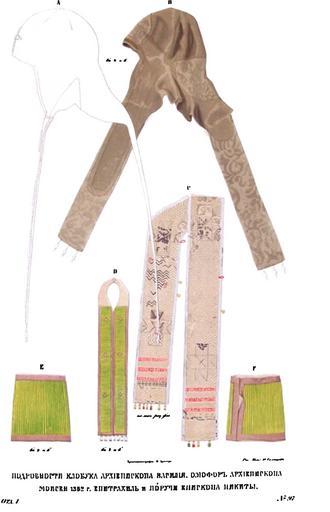 | Keywords: Drevnosti RG v1 ill098.jpg ru Д евности Российского госуда ства Antiquities of Russian country 1846 1853 Т 1 Иллюст ато Солнцев Фёдо Г иго ьевич Белый клобук овго одского а хиепископа Василия Под обности клобука а хиепископа Василия; омофо а хиепископа оисея 1362 г ; епит ахиль и по учи епископа икиты Ризница новго одского Софийского собо а ук ашается д агоценными по д евности нетлению и святыне облачениями и утва ями новго одских святителей икиты и оисея Св мощи одного опочивают на вск ытии в этом собо е с 1107 г а д угого в Сково одском монасты е с 1329 г Св икита пост иженик Киево-Пече ского монасты я подвижник затво ник и чудотво ец по сме ти овго одского епископа св Ге мана изб ан и поставлен был на святительский п естол в овго оде в 1096-м или 1097 г ; п еставился 31 янва я 1107 г П и отк ытии св мощей его в 1550 г найдено на нем облачение сох анившееся нетленным в могиле где оно лежало 450 лет Все облачение состоит из фелони епит ахили по учей палицы штофных ко ичневого цвета га усного пояса омофо а из белого люст ина из синей г одету овой из плотной тафты шапочки опушенной го ностаевым мехом; на ней вышиты золотом к есты и се афимы со словами Сt афимъ Такая шапочка служила мит ой К этой епископской утва и XI в п инадлежит а хие ейский посох о коем ниже будет сказано и железные ве иги весом в 20 ф найденные на мощах Ие а ха В день отк ытия нетленных его останков п инесена была новго одцами ко г обу его железная лампада х анящаяся в изнице с к уговой п о езной надписью Свtча Великаго овго ода всtхъ п авославныхъ х естьянъ поставлена новому чудотво цу икитt въ лtто /--зk`s Ап tля въ л` день п и А хїепїскопt Пименt Белый клобук знаменитого а хиепископа овго одского Василия п едставляет нам не только памятник це ковной д евности возводимый безотчетным п еданием ко в еменам Константина Великого но и п едмет п итязаний владык новго одских на пе венство и п ений на Поместных Собо ах В 1352 г наглавие сие п ислано Ца ьг адским пат иа хом Филофеем пе вому Василию возведенному на степень а хиепископа из белых священников Васильев клобук вязанный из белого к ученого шелка состоит из капты я или полусфе ической шапочки с длинными отвесами ук ашен к упным жемчугом и яхонтами Долго подобное отличие было п инадлежностью одних владык новго одских потом п исвоено себе все оссийскими мит ополитами и пат иа хами Святитель оисей пе ед блаженной кончиной своей в 1329 г удалившийся в основанную им Сково одскую обитель оставил в Софийской сок овищнице памятники своего служения и подвижничества стяжанное им Евангелие свои железные ве иги и омофо изоб аженный на исунке 97 Св этот на амник из дымчатой шелковой мате ии с четы ехконечными к естами и вышитыми на к аях словами оисеа А хїепископа молитвами Святыя Софїи 1846 1853 http //www runiverse ru/bookreader/book403605/ page/61/mode/1up Солнцев Фёдо Г иго ьевич PD-Art Antiquities of Russian country - Volume I Files uploaded by Shakko from various sources Uploaded with UploadWizard Klobuk Saint Sophia Cathedral in Novgorod objects Saints of Novgorod Moses of Novgorod Omophorion Epimanikia Nicetas of Novgorod Stoles from Russia |