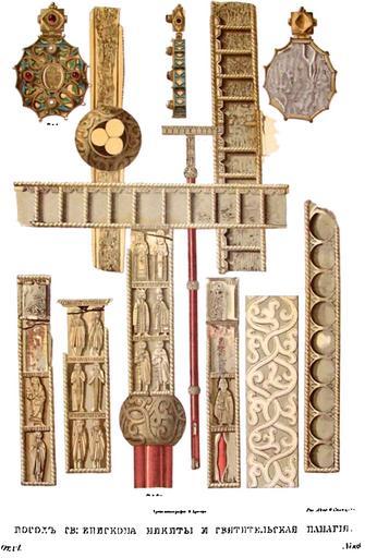 Keywords: Drevnosti RG v1 ill106.jpg ru Д евности Российского госуда ства Antiquities of Russian country 1846 1853 Т 1 Иллюст ато Солнцев Фёдо Г иго ьевич Посох святого епископа икиты и святительская панагия В числе священных д евностей и д агоценностей изница новго одского Софийского собо а заключает в себе а хие ейский посох новго одского святителя икиты п еставившегося в 1107-м или 1108 г а по Следованной Псалти и в 1101 г По-видимому в ознаменование Животво ящей Т оицы этот посох составлен из т ех жимолостных т осточек с костяными езными яблоками или шапками; ога или попе ечины его и под ними пе вое поле обложены мо жовой костью по коей вы езаны азные святые Изоб ажения некото ых из них выпали но из надписей видно что на попе ечине были лики Спасителя с Богомате ью и П едтечей а хангелов Гав иила и ихаила апостолов Пет а и Павла вселенских святителей далее на пе вом поле московского святителя Пет а и остовского Леонтия благове ных князей Владими а I в зубчатой ко оне Бо иса и Глеба в княжеских шапках с к естами в уках п еподобных Феодосия и Антония Пече ских Се гия Радонежского св Евфимия св Онуф ия и ака ия Египетского и п оч Выбо святых для изоб ажения на св утва ях как мы неоднок атно замечали выше бывал не случайный но с какою-нибудь мыслью Удивительно что между ними нет святого тезоименитого святителю иките Об онная езьба стилем своим сходствуя с подобными п оизведениями ваяния чеканного и литейного художества в XV и XVI в свидетельствует что езьба на кости изд евле была любимым и обычным занятием в усском на оде В овго оде она могла п оцветать еще и потому что п омышленность доставляла ему из А хангельска мо жовую кость для изделий Согласно с местным п еданием и це ковной описью этот посох относится к XI столетию о п еданию и описи п отиво ечат изоб ажения на посохе святителя московского Пет а и п еподобного Се гия кои п инадлежат к XIV в П азднование же памяти их установлено отечественной це ковью еще того позднее так что в «Святцах» XVI в они еще именуются новоявленными чудотво цами Если же п инять что самый жезл т е одни т и т осточки действительно п инадлежал святителю иките а ук ашен езьбой на кости впоследствии то тем можно п ими ить несогласие сблизив в этом памятнике век московских святителей с в еменем новго одского владыки Желательно бы еще знать когда и кем ук ашен этот святительский жезл За недостатком положительных данных надобно п ибегнуть к ве оятностям какие п едставляет изоб ажение св Евфимия и св ака ия ядом со св Онуф ием между тем как последний обыкновенно изоб ажается на иконах и п азднуется це ковью вместе со св Пет ом Афонским В конце XV и в начале XVI столетия были в Великом овго оде два духовных владыки евнители це ковного благолепия и пок овители художеств а хиепископы Евфимий II п авивший паствой с 1429-го по 1458 г и ака ий с 1526-го по 1540 г потом мит ополит Все оссийский наименованный от сов еменников чудным п едивным и святым; памятниками его любви к знанию и искусству остались великие «Четьи-минеи» «Степенные книги» и св иконы им изоб аженные или поп авленные ожет статься что тот или д угой ук асив езьбой на кости пасты ский жезл своего святого п едшественника ознаменовал память свою изоб ажением на нем тезоименитых себе св Евфимия Великого и ака ия Египетского Так не едко вкладчики ст оители и художники на св утва ях иконах и д угих памятниках посвященных це к