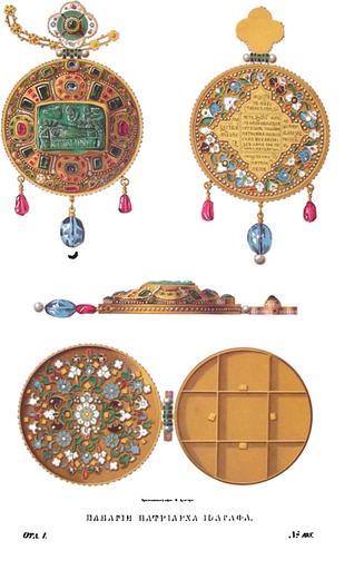 Keywords: Drevnosti RG v1 ill109.jpg ru Д евности Российского госуда ства Antiquities of Russian country 1846 1853 Т 1 Иллюст ато Солнцев Фёдо Г иго ьевич Панагия пат иа ха Иоасафа ежду великокняжескими и ца скими егалиями в О ужейной палате находится и пат иа шая панагия п ек асная по аботе и д агоценная по мате иалам Лицевую ее сто ону ук ашает оп авленный в золото камей из большого х изоп аза на коем вы езан об аз Успения Богомате и х амовой Пат иа хии Г еческая надпись обна уживает г еческое изделие кото ое московским художником вставлено в панагию ук ашено д агоценными камнями и финифтью ознаменовано усскими надписями С об атной сто оны отк ывается половинка на коей наведены че нью следующие надписи к естооб азно азмещенные и мощи святого мученика Евстафия Плакиды святого мученика е ку ия п еподобного Александ а Сви ского великомученика Пантелеймона В се едине читаете Лtта /--з `од повелtнїемъ Великаго Гспд`на Святtйшаго Iоасафа Пат їа ха осковскаго ї всеа Росиї здtлана сїя панагtя Год 1671 показывает что она п инадлежала седьмому пат иа ху осковскому Иоасафу II хи отонисанному из а химанд итов Т оице-Се гиевой лав ы 29 декаб я 1667 г и скончавшемуся 17 фев аля 1672 г еизвестно только по какому случаю этот знак святительства поступил в О ужейную палату а не в Пат иа шую изницу 1846 1853 http //www runiverse ru/bookreader/book403605/ page/61/mode/1up Солнцев Фёдо Г иго ьевич PD-Art Files uploaded by Shakko from various sources Antiquities of Russian country - Volume I Panagias Uploaded with UploadWizard Joasaphus II