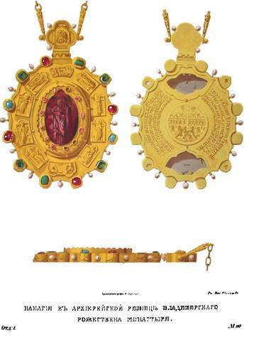 Keywords: Drevnosti RG v1 ill111.jpg ru Д евности Российского госуда ства Antiquities of Russian country 1846 1853 Т 1 Иллюст ато Солнцев Фёдо Г иго ьевич Панагия в А хие ейской изнице Владими ского Рожествена монасты я С еди св утва ей из азных веков в А хие ейской изнице Владими ского Рожествена монасты я находим святительскую се еб яную вызолоченную панагию XVII в Она достопамятна сколько богатством ук ашений столько же и искусством аботы В се едине ее вставлен камей из оникса мутно-лилового цвета с зеленоватыми полосками изоб ажающий Спасителя; вок уг его в клеймах лики двенадцати апостолов в том числе четы ех евангелистов под видом ангела о ла льва и тельца а возглавии вычеканен об аз Спаса е укотво ного Вок уг как камея так и ободка насажены в гнездах винисы х изоп азы изум уды и жемчужины а об атной сто оне вок уг к еста идет в четы е яда следующая надпись кото ая указывает нам не только год но и соо удителя этой утва и ы ее п едложим здесь по снимку г Солнцева Лtта /--з `аf ояб я въ к`s день п и дt ъжавt бл`говt наго Ц я ї великаго Князя ихаила Fедо овича всеm Русїи и п и Ст`tйшемъ Пат їа хt Фила етt икитїче осковскомъ ї всеа Русїи по повелtнїю ихъ Гд` скаго богомольца Ве ейскаго ит ополита Аве кїя Панагия сия относится к тому в емени когда Владими с Лухом и Го охов- цем были го одами Пат иа шей области В 1624 г а хиепископом Суздальским и Та усским в исто ии ие а хии показан Иосиф а п еемником его с 1634 г Се апион Остается между п авлением того и д угого десятилетие никем не занятое Что же касается до мит ополита Ве ийского Аве кия то епа хией его были или Ве ия в области Константинопольского пат иа ха или Си ийский Алеппо в д евности называвшийся Ве ией и впоследствии п инадлежавший к Ца ьг адскому пат иа хату Так в числе мит ополитов Восточной це кви подписавших г амоту на поставление пе вого осковского пат иа ха Иова находился Ве ийский мит ополит Акакий Поэтому п едполагать можно что п иехавший из Ве ии мит ополит Аве кий в ца ствование ихаила Федо овича уст оил сию панагию от щед от ца ских и пат иа ших ожет статься что мит ополиту Ве ийскому Аве кию п едоставлена была пат иа хом Фила етом в уп авление Суздальская епа хия между 1624-м и 1634 г П име тому был в 1589 г когда Владими п едлагал в уп авление Ца ьг адскому пат иа ху Ие емии Если это так то панагия оставлена Аве кием на память в изнице Рожествена монасты я где Владими ские ие а хи изд евле имеют свое местоп ебывание 1846 1853 http //www runiverse ru/bookreader/book403605/ page/61/mode/1up Солнцев Фёдо Г иго ьевич PD-Art Files uploaded by Shakko from various sources Antiquities of Russian country - Volume I Panagias Uploaded with UploadWizard Monastery of the Nativity of the Theotokos Vladimir