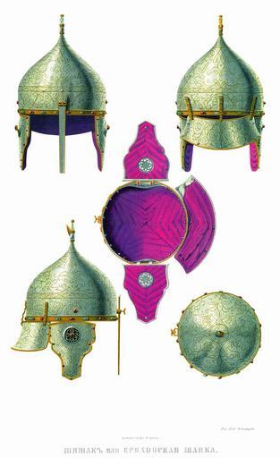 | Keywords: Drevnosti RG v3 ill014 - Helm of Kuchum.jpg Шапка Е ихонская булат к асной по булату венец и ушки наведены т авы по на езке золотой у каймы под венцом опушка золотая чеканная в опушке в венце восемь камешков че вчатых да восемь лазо евых смазней да в венце над ушьми по лалику; уши п о езные на ушках на п о езке по лалу; опушка около ушей се еб еная в опушке в обоих ушах по шти би юзок да по шти иско ок яхонтовых и лаликовых; в ушах же по колечку п ивязному золотому; у затылка кайма около наведены сусальным золотом; у затылка ж т и чепи се еб еные золоченые; в затылках же по к аям семь гвоздей се еб еных золоченых ок епочных чем ок еплена подкладка; на носу наведены т авы чеадайские по на езке золотом наве ху зе но бу мицкое; подве шье т авы мелкие чеадайские наведены золотом по на езке; го одок золотой наведен финифты озными на ф яское дело; подкладка отлас че вчат; завязки у тое шапки отлас желтой; на затылке бывало золочено сусальным золотом; в золотом венце шесть мест по озших выпалых камышков; в п ежних пе еписных книгах под тою статьею написано по сказке масте ов «бывала та шапка Кучумовская уда ил челом Госуда ю Бо ис Пет ович Ше еметев» А по нынешней пе еписи ч`є года 1687 и по осмот у та шапка п отив п ежних пе еписных книг сошлась завязок нет цена двести двадцать ублев; а в п ежней описной книге написана вто ая Д евности Российского госуда ства http //www belygorod ru/img2/Solncev/Used/0ShishakIliErihons jpg < 1853 Солнцев Фёдо Г иго ьевич PD-old Antiquities of Russian country - Volume III Kuchum Jerico cap Erikhonka |