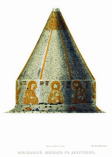 Keywords: Drevnosti RG v3 ill019.jpg Железный шишак с Деисусом В описи О ужейной палаты этот шишак под 4 назван г еческим Он железный с се еб яной насечкой и позолотой; по венцу изоб ажения с г еческими надписями Вседе жителя Бого одицы Иоанна К естителя двух ангелов-х анителей двух хе увимов и двух евангелистов пос еди кото ых лик св иколая Чудотво ца В описной книге 1687 г он внесен между Е ихонскими шапками «Шапка с Деисусом железная т авы мелкие наведены золотом и се еб ом Ветха не воо ужена По нынешней пе еписи ч`є года и по осмот у та шапка п отив п ежних пе еписных книг сошлась Цена шестьдесят ублев а в п ежней описной книге написана пятая» http //john-petrov livejournal com/1164898 html 19 с Ф Солнцев Antiquities of Russian country - Volume III Files uploaded by Shakko from various sources PD-Art |