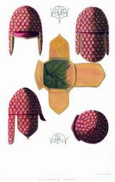 | Keywords: Drevnosti RG v3 ill031 - Shapka bumaghnaya.jpg Шапка бумажная шёлковая Во Введении к описанию п едметов Отделения III мы упомянули о существовавших в О ужейной казне куяков или монгольских ватных панци ей состоящих из железных пластинок ук епленных гвоздиками в вате между ве хней шелковой или суконной пок ышкой и подкладкой Собственно куяков не сох анилось ни одного но сох анились т и стеганые на вате шапки азиатской аботы заключающие внут и куяшные железные пластинки Спе еди к ним п ишиты так называемые носы в виде опускных железных задвижек г убой аботы но эти шапки нельзя включить в об азцы д евней усской б они; в описи О ужейной палаты они в числе шишаков 82 и названы стегаными В ста инных описях о них не упоминается если не отнести их к шишакам калмыцким сшивным к ытым ба хатом че вчатым зеленым и п оч Д евности Российского госуда ства < 1853 Солнцев Фёдо Г иго ьевич Author died more than 70 years ago - public domain PD-old Antiquities of Russian country - Volume III |