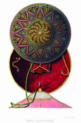 | Keywords: Drevnosti RG v3 ill068 - Kalkan Kamysh.jpg en Shield Kalkan ru Щит камышовый В 1658 г послы Име етинского ца я Александ а п ивезли ца ю Алексею ихайловичу в да два щита Один из этих щитов ис 68 внесен в опись 1687 г с обозначением этой п исылки «Щит витой волоченым золотом с озными шолки; наве ху плащ булатной косые г ани наведены золотом; меж наводных г аней г ани золотые с каменьем; наве ху плаща т убочка золотая с би юзками; на большом плаще в золотых г анях в гнездах восемьдесят два камышка би юзок и яхонтиковых иско ок в том числе со ок мест по озжих а иные гнезда оз ы маны; десять епейков железные золочены в них п ик еплены с исподи десять колец; подложен и подушечка ба хат че вчат п ивяска и воо уда столбец шолк зелен кольца железные По записной книге написано «Великому Госуда ю челом уда или елетинскаго Александ а Ца я послы во k`з году 1659 цена т и убли» А по нынешней пе еписи ч`є года тот щит п отив п ежних пе еписных книг сшолся а по осмот у и с п ежними шестьдесят мест по озжих; цена тому щиту пятьдесят ублев а в п ежней описной книге написан пе вой надесять» Щит изоб аженный на исунках 66 и 67 внесен в опись без означения откуда поступил «Щит шит золотом и шолком на нем мишень по булату насечено золотом и каменьем; в гнездех би юзы десять лаликов да изум удец да иско ки лаловые а в иных местех и каменья нет гнезда сломаны; подложен ба хатом удожолтым; десять колец медных; п ивяска тесма и сну ы шолк зелен; на ве ху в маковке каменя нет два места по озжи и с т етьего места в се едине выломлено семьдесят мест по озжих А по нынешней пе еписи ч`є года п отив п ежних пе еписных книг сшолся и по осмот у све х п ежних два места по озжих и с гнездами нет; цена тому щиту пятьдесят ублев а в п ежней описной книге написан т етей надесять» pl Tarcza Kałkan Д евности Российского госуда ства http //www belygorod ru/img2/Solncev/Used/0SchitKamyshovyy jpg Солнцев Фёдо Г иго ьевич < 1853 PD-old Antiquities_of_Russian_country_-_Volume_III Kalkan shield |