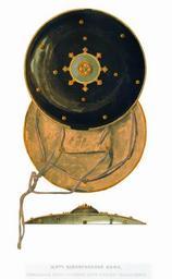Keywords: Drevnosti RG v3 ill074 - Shield from Inrog.jpg Щит пода ил посол пе сидского шаха Аббаса II Ага Ассан ца ю ихаилу Фёдо овичу 29 декаб я 1644 года «Щит кожа ин оговая че ная; на ве ху щита плащ к углой би юза в золоте на нем запона к углая золотая в запоне камень изум уд да четы е зе на кафимских бу мицких да четы е яхонтика да шестнадцать иско ок яхонтовых же че вчатых да т идцать две би юзки да около би юзнаго плаща семьдесят одно зе но жемчужных да т и места по озжих; да около того ж плаща восемь епьев золотых в том числе в т ех по пяти яхонтиков че вчатых да по семи би юзок маленьких в том числе место би юзное по озжо; в т ех же епьях по жемчужному зе ну бу мицкому кафимскому да в двух епьях по изум уду; около зе ен и изум удцов по четы е яхонтика че вчатых да по семи би юзок маленьких; одиннадцать епьев золотых п ик еплены петли золотые ж; около щита венец золотой во многих местех попо чен в нем жемчужных двести девяносто семь зе ен девять мест по озжих; подложен косматым шелком под петлеми к ужечки золотые ж; чемоданец ба хат Пе сидской золотой подложен до огами двоелишными В чемоданце в бумаге выполое жемчужное зе нышко да изум удная иско ка По записным книгам написано «Великому Госуда ю п ислал в да ех Кизылбашской шах Оббас в н`в году; цена сто пятьдесят один убль двадцать алтын» А по нынешней пе еписи ч`є года и по осмот у тот щит п отив п ежних пе еписных книг сшолся вве ху в к угу и в кайме двадцати одново жемчуга нет» Д евности Российского госуда ства < 1853 Солнцев Фёдо Г иго ьевич Author died more than 70 years ago - public domain PD-old Antiquities of Russian country - Volume III