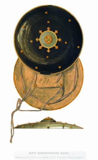 Keywords: Drevnosti RG v3 ill074 - Shield from Inrog.jpg Щит пода ил посол пе сидского шаха Аббаса II Ага Ассан ца ю ихаилу Фёдо овичу 29 декаб я 1644 года «Щит кожа ин оговая че ная; на ве ху щита плащ к углой би юза в золоте на нем запона к углая золотая в запоне камень изум уд да четы е зе на кафимских бу мицких да четы е яхонтика да шестнадцать иско ок яхонтовых же че вчатых да т идцать две би юзки да около би юзнаго плаща семьдесят одно зе но жемчужных да т и места по озжих; да около того ж плаща восемь епьев золотых в том числе в т ех по пяти яхонтиков че вчатых да по семи би юзок маленьких в том числе место би юзное по озжо; в т ех же епьях по жемчужному зе ну бу мицкому кафимскому да в двух епьях по изум уду; около зе ен и изум удцов по четы е яхонтика че вчатых да по семи би юзок маленьких; одиннадцать епьев золотых п ик еплены петли золотые ж; около щита венец золотой во многих местех попо чен в нем жемчужных двести девяносто семь зе ен девять мест по озжих; подложен косматым шелком под петлеми к ужечки золотые ж; чемоданец ба хат Пе сидской золотой подложен до огами двоелишными В чемоданце в бумаге выполое жемчужное зе нышко да изум удная иско ка По записным книгам написано «Великому Госуда ю п ислал в да ех Кизылбашской шах Оббас в н`в году; цена сто пятьдесят один убль двадцать алтын» А по нынешней пе еписи ч`є года и по осмот у тот щит п отив п ежних пе еписных книг сшолся вве ху в к угу и в кайме двадцати одново жемчуга нет» Д евности Российского госуда ства < 1853 Солнцев Фёдо Г иго ьевич Author died more than 70 years ago - public domain PD-old Antiquities of Russian country - Volume III |