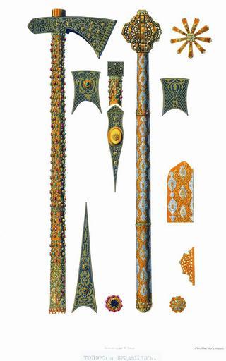 Keywords: Drevnosti RG v3 ill079 - Topor i Buzduhan.jpg Топо и буздыхан В описи О ужейной палаты значится под 3 се еб яный с позолотой Девять п о езных пе ьев обсажены сна ужи би юзой Чеканеный че ен в узо по золоченому полю се еб яные с че нью обводы и в них золоченые цветы По че ену два пояска и ве хняя и нижняя оконечности пе ната ук ашены би юзой яхонтами и изум удами Д евности Российского госуда ства http //john-petrov livejournal com/1190678 html Солнцев Фёдо Г иго ьевич < 1853 PD-old Antiquities of Russian country - Volume III Files uploaded by Shakko from various sources Battle axes of Russia