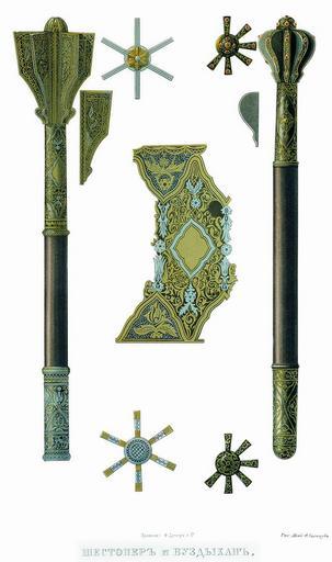 | Keywords: Drevnosti RG v3 ill080.jpg Шестопе и буздыхан В описи О ужейной палаты в числе шестопе ов « 10 стальной об осьми пе ьях из коих двух недостает; полуяблоко на ве ху и пе ья ук ашены яхонтовыми иск ами; че ен де евянный т убки насечены золотом 5 стальной с осемью гладкими небольшими пе ьями и гладким полуяблоком на ве ху; т убка езана полосками п ямо и вкось Че ен де евянный» Д евности Российского госуда ства http //john-petrov livejournal com/1190678 html Солнцев Фёдо Г иго ьевич < 1853 PD-old Antiquities of Russian country - Volume III Files uploaded by Shakko from various sources |