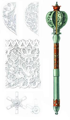 | Keywords: Drevnosti RG v3 ill081b - Shestopior.jpg Шестопё «Пе нат о шти пе ах на пе ье п о езаны т авы и поставлены в лице об учи вызолочены п иве нуты щу упами в об уче по т и щу упа железные; на ве ху ко уна с яблоком п о езным вызолочены а на ве ху яблока малинькие яблочки железные не золочены; под пе ьем яблоко с по езкою; в лице под яблоком п ием медной п о езной позолочен; посе едь яблока и от яблока укоятка г аненая позолочена; повыше исподнева яблока спуск медной п о езной позолочен и п иве нут одним щу упом; яблоко че ез г ань п о езано; под исподом яблока поставлено в лице с пуговкою пуговка сквозная» Д евности Российского госуда ства < 1853 Солнцев Фёдо Г иго ьевич Author died more than 70 years ago - public domain PD-old Antiquities of Russian country - Volume III Ceremonial maces Flanged maces Maces of Russia Pernach |