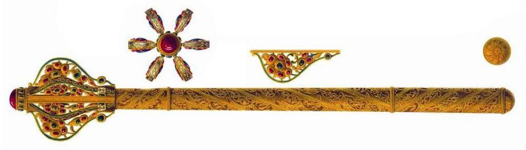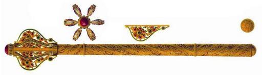 Keywords: Drevnosti RG v3 ill084a - Shestopior.jpg Шестопё Пода ен Алексею ихаловичу в 1655 «Быздыган пе ья п о езные золотые с винивты в главе яхонт че вчет большой г аненой под ним десять изум удов; в пе ье сто восемь яхонтов че вчатых да т идцать шесть изум удов; че ен п о езной золот попо чен; исподняя т убка сходит; по я лыку написан тот быздыган шестопе ом; челом уда ил Великому Госуда ю тем быздыганом Г еченин Дмит ей Остафьев по k`г году июля в к`з день А по нынешней пе еписи ч`є года и по осмот у тот быздыган п отив п ежних пе еписных книг сшолся; цена тому быздыгану шестьсот пятьдесят ублев а по п ежней описной книге написан вто ым» Д евности Российского госуда ства < 1853 Солнцев Фёдо Г иго ьевич Author died more than 70 years ago - public domain PD-old Antiquities of Russian country - Volume III Ceremonial maces Flanged maces Maces of Russia Pernach