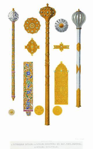 Keywords: Drevnosti RG v3 ill086.jpg А ту ецкая булава Б булава боя ина великого князя Василия ихайловича Лыкова В булава булатная В О ужейной палате х анится под 32; в описной книге 1687 г названа «ту ской» «Булава х устальная ту ская че ен обложен се еб ом с финифты сканной; подзо се еб яной золоченой; на че ену в т ех поясках камешки виниски че вчетые А по нынешней пе еписи ч`є года и по осмот у та булава п отив п ежних пе еписных книг сошлась; а по осмот у в че ену в нижнем поясу двух винис нет; цена той булаве шестьдесят пять ублев а в п ежней описной книге написана седьмою» В описи О ужейной палаты п оходит под 20 Эта булава се еб яная позолоченная Резные в узо яблоко и че ен ук ашены сто одной би юзой в гнездах а об азе че ена вы езана подпись Б ` К ` Б ` ` Л ` т е Боя ина Князя Бо иса ихайловича Лыкова В О ужейной палате под 36 В описной книге 1687 г «Да све х п ежней описной книги булава булатная с долами долы с путиками че ез дол вы езывано золото т авками; на главе яблочко наведено че ез полоску золотом; под главою до пояска и ниже пояска в езывано золото т авками; цевье с долами долы с путиками; пониже цевья к че ену в езывано золото ж че ен гладкой по конец че ена в поляблочка наведено было золотом же; цевье ж тоще в нем положено железцо и г емит; цена той булаве шестьдесят ублев» В емя поступления этой булавы в О ужейную казну неизвестно но находившаяся в казне сове шенно сходная с изоб аженной была московского дела п и о ужничем князе Бо исе Александ овиче Репнине «Булава к аснаго железа Дмит еева дела Рошка делана с долы че ез дол наведено золотом; че ен оп авлен се еб ом белым и золоченым; делана п и боя ине Князе Бо исе Александ овиче Репнине А по нынешней пе еписи ч`є года и по осмот у та булава п отив п ежних книг сошлась на ней укоятка да две обоймицы се еб яны золочены; под булавою по пояску наведено волоченым золотом; цена той булаве т идцать пять ублев а по нынешней описной книге написано т етью надесять» Д евности Российского госуда ства http //john-petrov livejournal com/1190678 html Солнцев Фёдо Г иго ьевич < 1853 PD-old Antiquities of Russian country - Volume III Files uploaded by Shakko from various sources House of Repnin