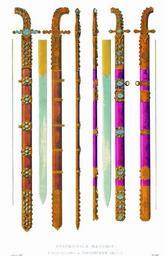 | Keywords: Drevnosti RG v3 ill094 - Palash.jpg en Moskow backswords before 1687 ru Два палаша осковского п оизводства Из описи 1687 <br /> «Полаш полоса стальная осковскаго дела; от к ыжа по обе сто оны золочено; к ыж и че ен се еб еные т авчатые; устье пять б анца наконешник т авы чеканные золочены; на че ену ж и на к ыже и на устье и на б анца ах и на наконешнике сто двенадцать би юз; ножны пок ыты ба хатом алым; пояс тесма шолковая цветная А по нынешней пе еписи ч`є года тот полаш с п ежними пе еписными книгами сшолся а по осмот у и по п ежним пе еписным и по нынешним книгам четы надцать би юз да в наболдашнике би юзы ж и колец нет Цена пятьдесят два убли а в п ежних пе еписных книгах написан десятым» <br /> «Полаш полоса стальная осковскаго дела от к ыжа по обе сто оны золочено; че ен и к ыж и устье пять обоймиц наконешник се еб еные золочены; на че ену ж и на к ыжу и на устье и на обоймицах и на наконешниках в гнездах семнадцать би юз в них в езывано золото с иск ы яхонтовыми по счету пятнадцать иско ок да т и места по озжи у одной обоймицы и гнезда золото и иск ы выпадали; около тех гнезд шестьдесят одна би юза кольцо у обоймицы се еб еное золочено а у д угова кольца нет отломлено; ножны пок ыты ба хатом че вчетым без пояса А по нынешней пе еписи ч`є года тот полаш с п ежними пе еписными книгами сшолся по нынешней пе еписи объявился; тесьма шолк цветной; цена со ок пять ублев а в п ежних пе еписных книгах написан т етьим надесять» Д евности Российского госуда ства http //www belygorod ru/img2/Solncev/Used/0StarinPalashi_3 jpg Солнцев Фёдо Г иго ьевич < 1853 Antiquities of Russian country - Volume III Swords of Russia Broadswords PD-old |