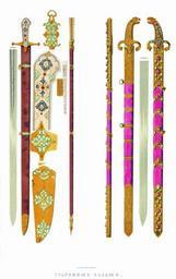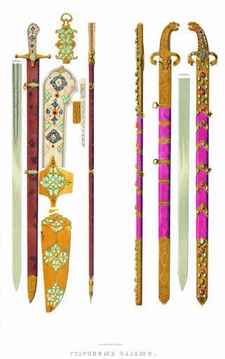 Keywords: Drevnosti RG v3 ill095.jpg Ста инные палаши В О ужейной палате под 7; в описи 1687 г под 5 «Полаш полоса стальная от к ыжа по обе сто оны дол от долу с обе сто оны еб о да от к ыжа по обе сто оны голомя золочено; на п авой сто оне два епейка ножны оболчены ба хатом алым; на ножнах оп ава к ыж две обоймицы наконешник золотые в них с обе сто оны в езываны би юзы; че ен кость ыбья плашками; а в них в езывано золото с би юзами гнездами на сто оне по семи гнезд и с обеих сто он изо шти мест золото выпало; на че ену меж плашек спаено золотом в скань; у обоймицы скобка золотая отломлена а вместо скобки положено кольцо се еб еное позолочено; пояс тесьма шолк цветной без оп авы А по нынешней пе еписи ч`є года с п ежними пе еписными книгами тот палаш сшолся; цена тому полашу сто со ок семь ублев А по п ежней описной книге тот полаш написан шестым надесять» Д евности Российского госуда ства http //john-petrov livejournal com/1190678 html Солнцев Фёдо Г иго ьевич < 1853 PD-old Antiquities of Russian country - Volume III Files uploaded by Shakko from various sources |