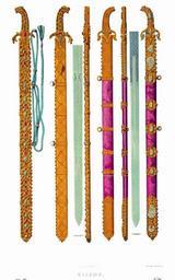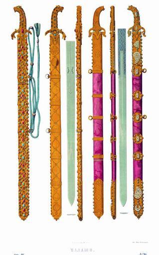 Keywords: Drevnosti RG v3 ill096.jpg Палаши Этот богатый палаш х анящийся в О ужейной палате под 16 неизвестно когда и откуда поступил в оную но судя по ту ецкой отделке и сходству укояти с п исланным палашом от олдавского господа я Василия ис 93 должно полагать что оный п ислан в да п и сношениях с олдавией п и Иоанне IV В статейных книгах посольств ту ецких и волошских упоминается что в 1680 г п исланный к госуда ю ца ю Федо у Алексеевичу от Волоского госуда я Юдуки волошанин Ю ья Павлов будучи на аудиенции подал госуда ю между п очими да ами Палаш оп авленный се еб ом с каменьем о описываемый палаш по описи 1687 г существовал уже в п ежних описных книгах «Полаш стальной на полосе от огнива по обе сто оны выте та голомя доликом около долика на п авой сто оне половина клеемца; ножны хоз се еб ен золочен езной; пять обоймиц че ен и огнива се еб еные золочены езные; в че ену и в огниве сплошь по всем ножнам в гнездах и в обоймицах сто т идцать один яхонтиков че вчатых больших и малых г аненых и гладких; се еди огнива яхонт че вчат большой г аненой да би юз сто пятьдесят две би юзы больших и малых да шесть изум удцов; у че ена в зве иных головах по че вчетому ко ольку в исподной губе колечко с т емя чепочки п ивяска столбец шолк лазо ев т и ва во ки шолковые цветные А по нынешней пе еписи и по осмот у тот полаш п отив п ежних пе еписных книг сшолся; по п ежним пе еписным книгам ч` году написано в оп аве пятьдесят мест по озжих где было каменья а по нынешней пе еписи и по осмот у и с п ежними со ока двух яхонтиков да двадцати четы ех би юз да т ех изум удцов у к ыжа нет да у к ыжа ж голова зве иная отломлена; цена сто девяносто два убли а в п ежней пе еписной книге написан четве тым» Х анится в О ужейной палате под 11; по сходству отделки и укояти с змеиными головами также должен быть отнесен к п исылке от господа ей олдавии В описи 1687 г сделанной с п ежних книг этот палаш в числе палашей в се еб яной оп аве означен вто ым «Полаш булатной наведен с п авые сто оны золотом и се еб ом; че ен и у к ужа змеиные головы в че ену у змеиной головы место по озжо; оп ава на ножнах се еб еная езная позолочена; в к ыжу и в че ену десять яшм а в них в езывано золото с иск ы яхонтовыми по счету восемь иско да пять мест по озжих; на устье и на пяти б анца ах и на наконешнике девять яшм в них пятьдесят одна иск а яхонтовые в золоте да четы надцать мест по озжих да в че ену ж и в к ыжу и в устье и в б анца ах и в наконешнике восемьдесять семь би юз да место по озжо; пояс тесма шолк цветной без оп авы; да в двух б анца ах четы е кольца се еб еные золочены ножны пок ыты ба хатом алым А по нынешней пе еписи ч`є года тот палаш сшолся и по п ежним пе еписным книгам ч` года написано в к ыжу и в че ену восемь иско ок да пять мест по озжих; да в десяти яшмах пятьдесят одна иск а да четы надцать мест по озжих а по нынешней пе еписи не объявилось в к ыже в че ену в яшмах иск ы яхонтовой да семь мест по озжих и с п ежними; да на устье и в б анца ах и в наконешнике в яшмах двух иско ок нет да шестнадцать мест по озжих и с п ежними да пояса нет; цена сто двадцать пять ублев а в п ежних пе еписных книгах написан шестым» Д евности Российского госуда ства http //john-petrov livejournal com/1190678 html Солнцев Фёдо Г иго ьевич < 1853 PD-old Antiquities of Russian country - Volume III Files uploaded by Shakko from various sources |